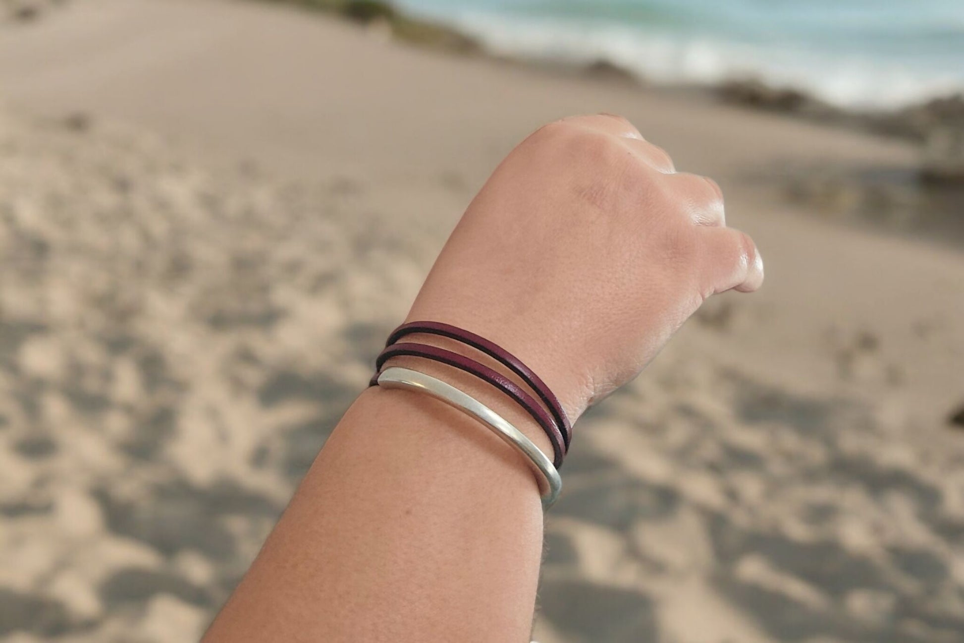Magnifique bracelet en cuir couleur bordeau et fermoir en plaqué argent.